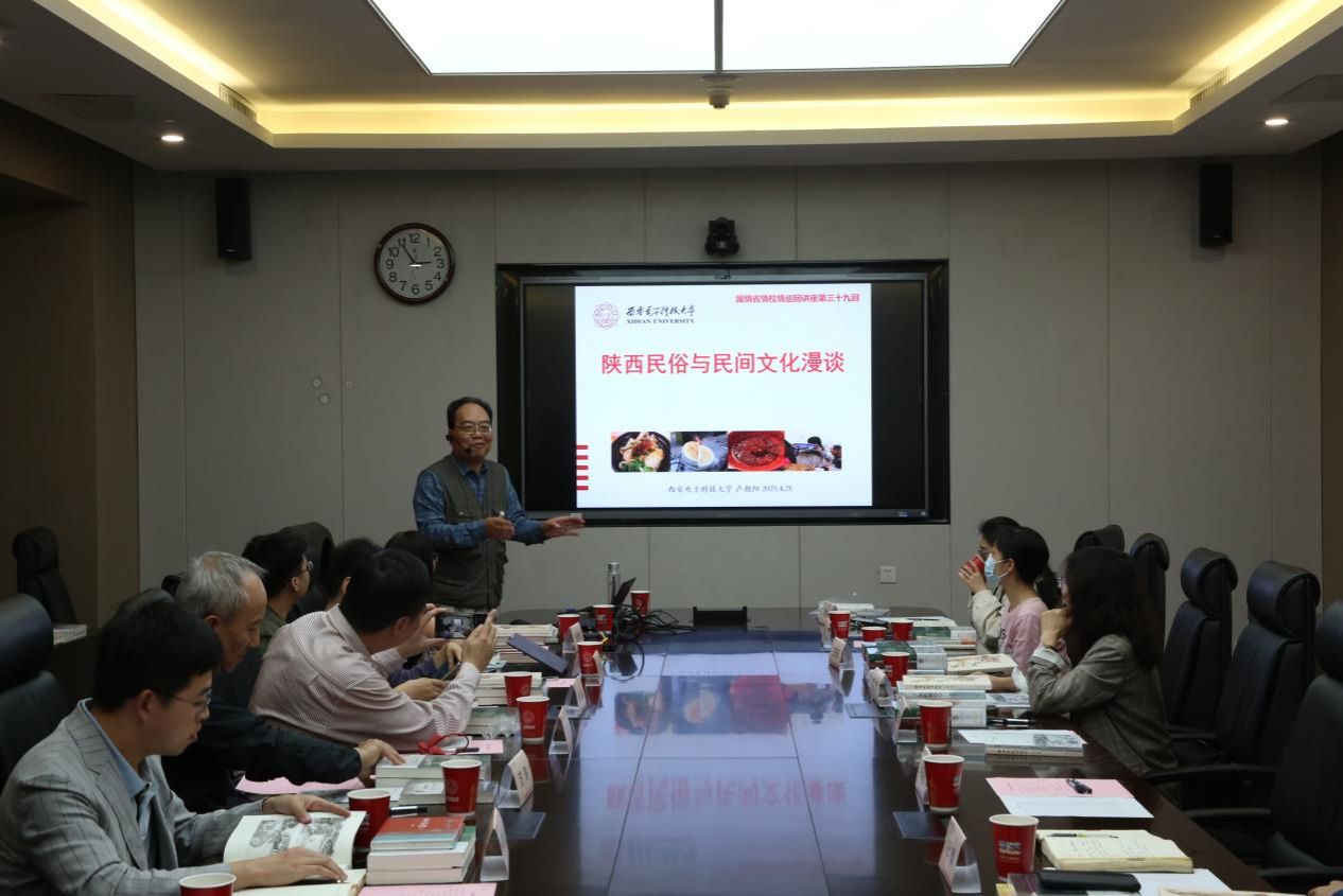 本次活動特別邀請通信工程學(xué)院教授盧朝陽作“陜西民俗與民間文化”主題分享,盧教授以其深厚的文化底蘊和生動的講述方式,帶領(lǐng)師生們由“從古至今的陜西”“人間百態(tài)的陜西”“民歌戲曲的陜西”三個篇章開啟文化之旅。報告分享了陜西的地形地貌、青銅器的輝煌、文字的演變、衣食住行的發(fā)展等,用視頻、歌曲等與師生交流互動的方式,為大家展現(xiàn)了陜北民歌、陜北說書、秦腔、皮影戲的藝術(shù)特色和價值。分享結(jié)束后,盧教授精心準備了《陜西民俗學(xué)概論》《遠遠鄉(xiāng)》兩本著作贈予現(xiàn)場師生。