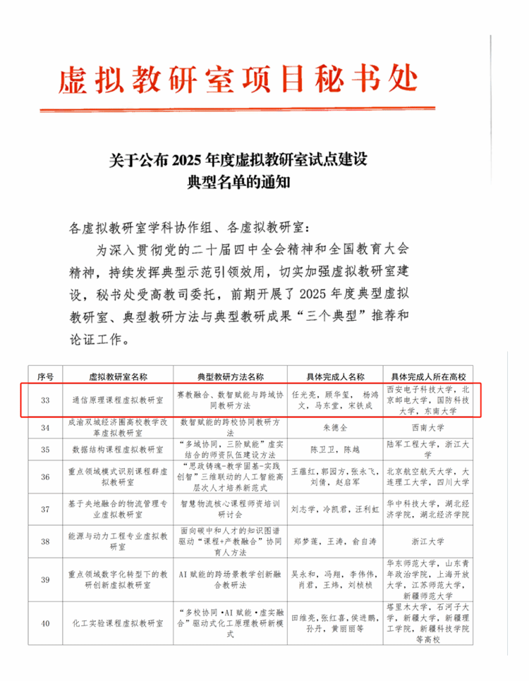 (通訊員 高文鑫)12月10日,教育部虛擬教研室公布了2025年度虛擬教研室試點(diǎn)建設(shè)典型名單,西安電子科技大學(xué)通信工程學(xué)院牽頭的通信原理課程虛擬教研室申報(bào)的“賽教融合、數(shù)智賦能與跨域協(xié)同教研方法”成功入選“典型教研方法”。