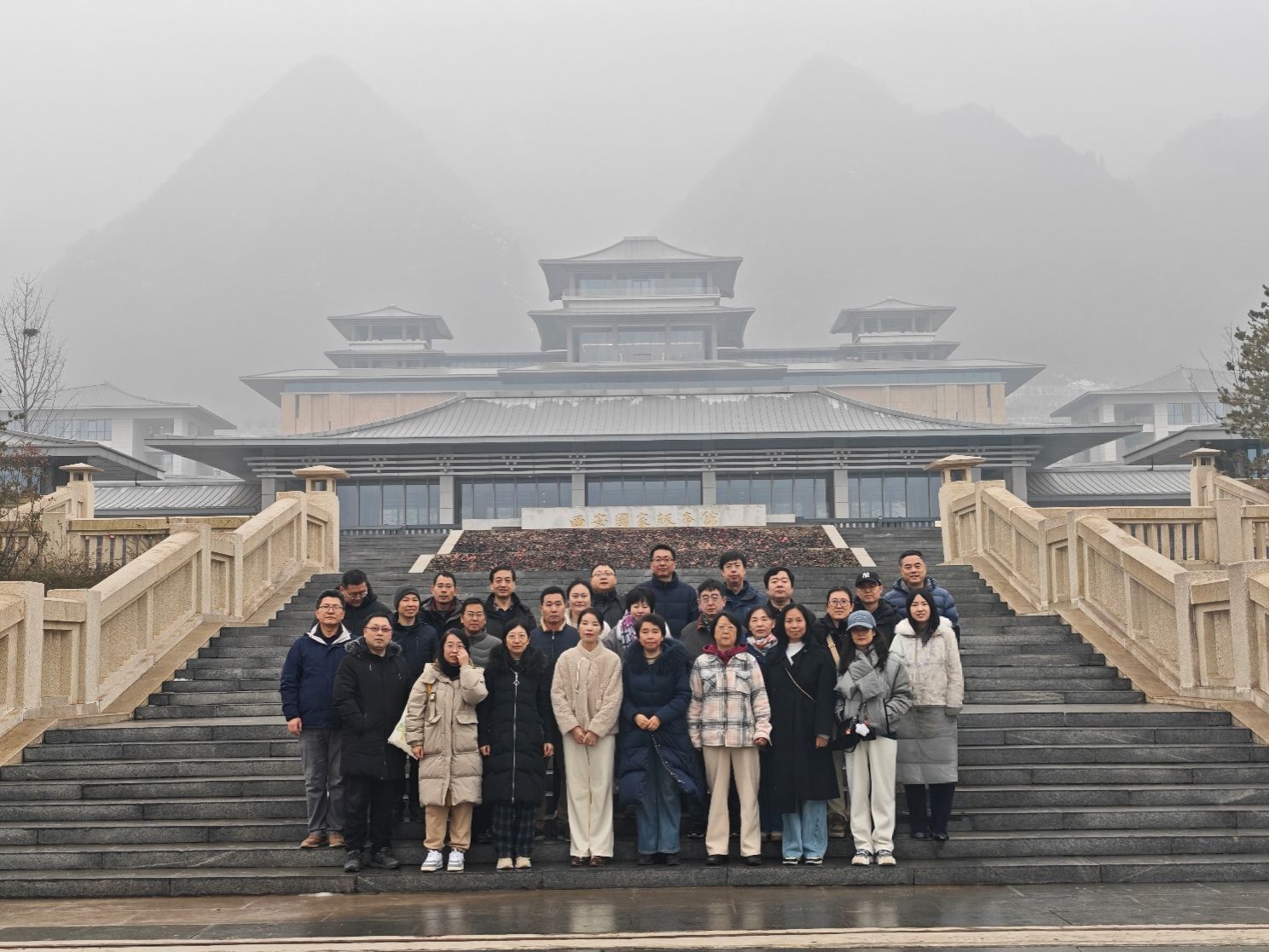 隨后,大家前往西安國(guó)家版本館,這座南倚秦嶺、北望渭川的文化殿堂,以“山水相融、天人合一、漢唐氣象、中國(guó)精神”為設(shè)計(jì)理念,承載著中華版本資源保藏、展示、研究與交流的重要使命,是賡續(xù)中華文脈、堅(jiān)定文化自信的重要標(biāo)識(shí)。步入園區(qū),文濟(jì)池與亭臺(tái)樓閣相映成趣,盡顯北方園林的莊嚴(yán)肅穆與靈動(dòng)雅致。在講解員的引導(dǎo)下,大家先后參觀了保藏中心、《賡續(xù)文脈踔厲前行——中華文化經(jīng)典版本展(西部篇)》與《楮墨遺珍萬(wàn)里同風(fēng)——絲綢之路版本展》等核心區(qū)域。此次參觀,不僅讓大家直觀了解了西安版本館作為“中華文化種子基因庫(kù)”的重要價(jià)值,更在潛移默化中增強(qiáng)了傳承中華文脈、弘揚(yáng)優(yōu)秀傳統(tǒng)文化的責(zé)任感與使命感。